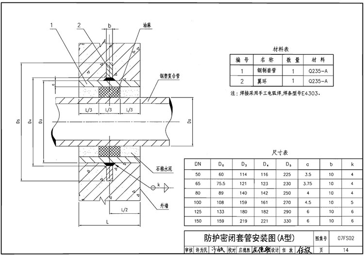 D型;鋼制套管 數(shù)量1材質(zhì)(Q235A)翼環(huán)數(shù)量1 材質(zhì)(Q235A)固定法蘭 數(shù)量1 材質(zhì)(Q235A 擋板數(shù)量1 材質(zhì)(Q235A)擋圈 數(shù)量1 材質(zhì)(Q235A) 說(shuō)明;鋼管和擋圈焊接后經(jīng)鍍鋅處理,再施行與套管安裝,填充材料施工完后,再施行擋板和固定法蘭焊接。