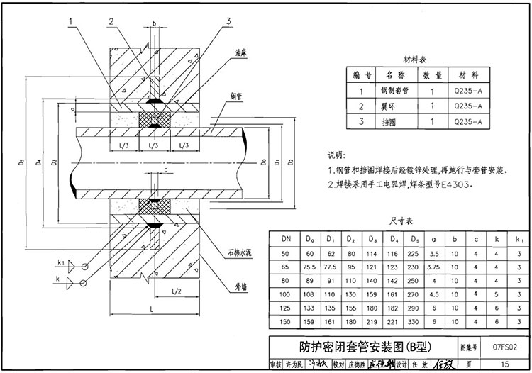 E型;鋼制套管 數(shù)量1材質(zhì)(Q235A)翼環(huán)數(shù)量1 材質(zhì)(Q235A) 固定法蘭 數(shù)量2 材質(zhì)(Q235A 擋板數(shù)量2 材質(zhì)(Q235A)管道和填充材料施工完后,再施行擋板和固定法蘭焊接。