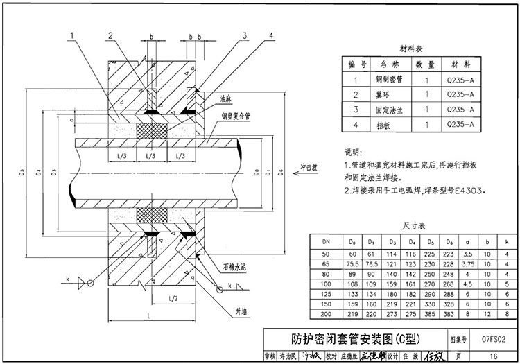 C型;鋼制套管 數(shù)量1材質(zhì)(Q235A)翼環(huán)數(shù)量1 材質(zhì)(Q235A) 固定法蘭 數(shù)量1 材質(zhì)(Q235A 擋板數(shù)量1 材質(zhì)(Q235A)說(shuō)明;管道和填充材料施工完后,再施行擋板和固定法蘭焊接。